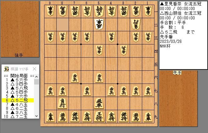 先手・里見女流五冠117手を以て、後手西山女流三冠を下しました。